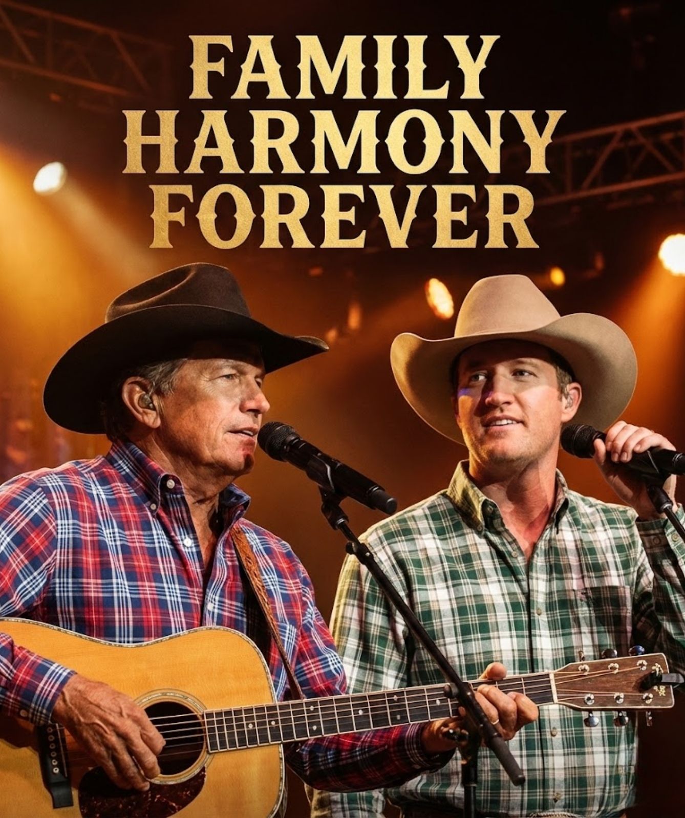 On this night, George Strait did something rare. He did not stand alone at the microphone. He did not carry the song by himself, as he has done so effortlessly for decades. Instead, he turned slightly—just enough—and welcomed his son, Bubba, into the circle of light. What followed was not merely a duet. It was a living conversation between generations, heard not only through melody, but through meaning.