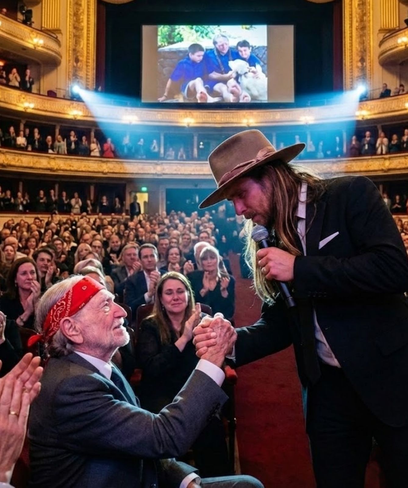 Willie’s shoulders lifted and fell slowly, a quiet rhythm beneath the music. He did not wipe his eyes. He did not look away. He received the song fully — not as an artist being honored, but as a father being seen.