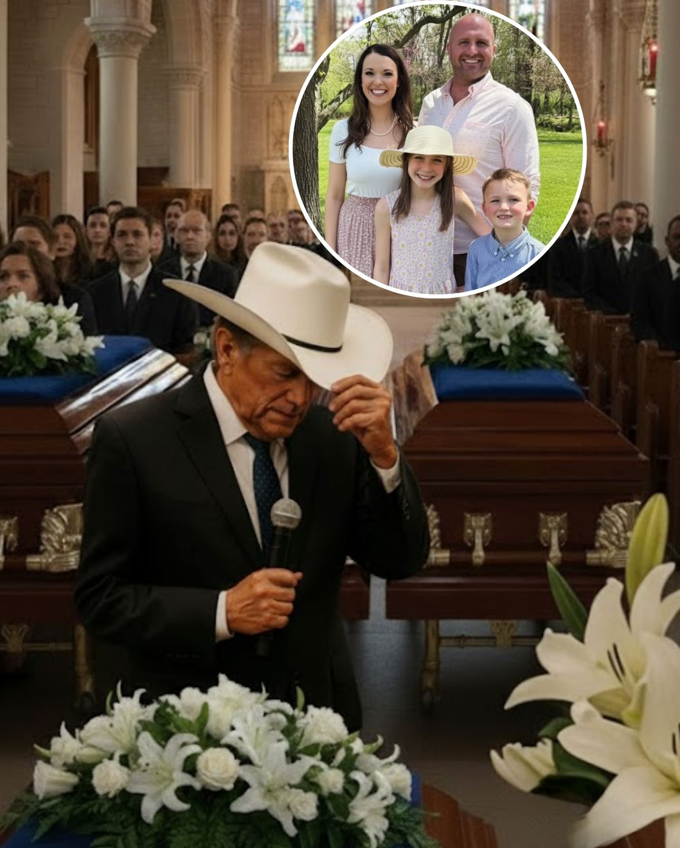 In a moment that no one expected — and that no one present will ever forget — George Strait, the King of Country, quietly arrived at a small rural chapel in southern Illinois to pay his respects to Darren Bailey and his grieving family. The visit came just days after the heartbreaking helicopter crash that claimed the lives of Bailey’s son Zachary, his daughter-in-law Kelsey, and their two children, Veda (12) and Samuel (7).