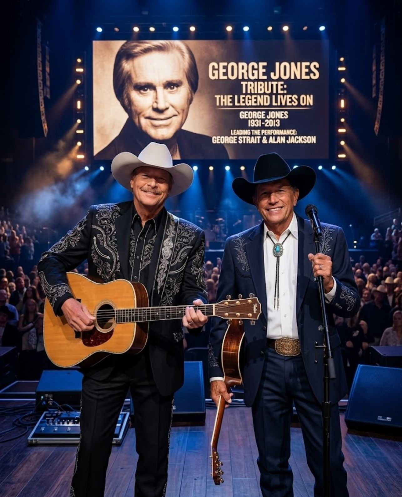 That night began like any great tribute should. Two towering figures of country music, George Strait and Alan Jackson, stood side by side, carrying the quiet responsibility of honoring a voice that had shaped generations. They weren’t just performers in that moment — they were guardians of memory, entrusted with something fragile and sacred.
