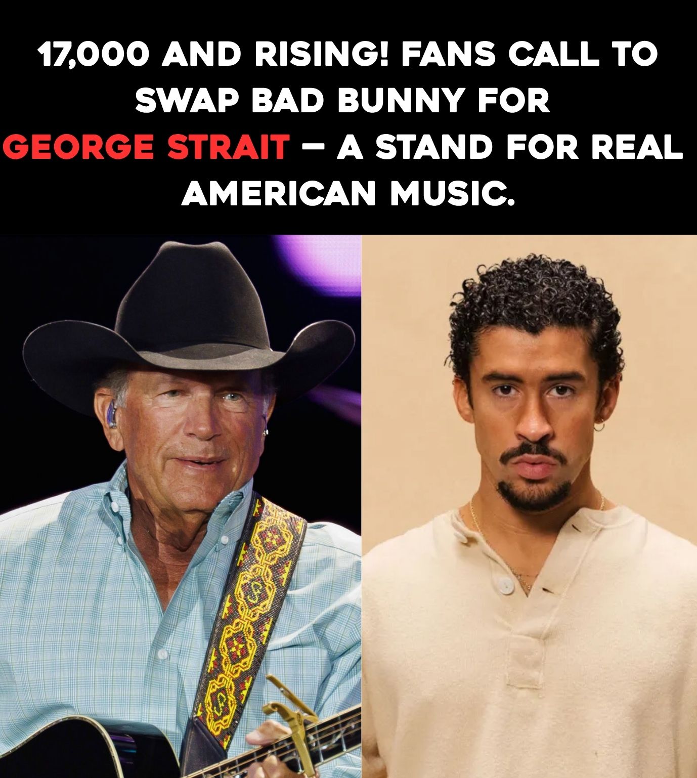 Just moments ago, a grassroots petition calling for country legend George Strait to replace Bad Bunny as the featured performer for Super Bowl LX’s halftime show officially surpassed 17,000 signatures — and the number continues to climb by the minute. What began as a small online campaign among traditional country fans has now erupted into a nationwide cultural movement.