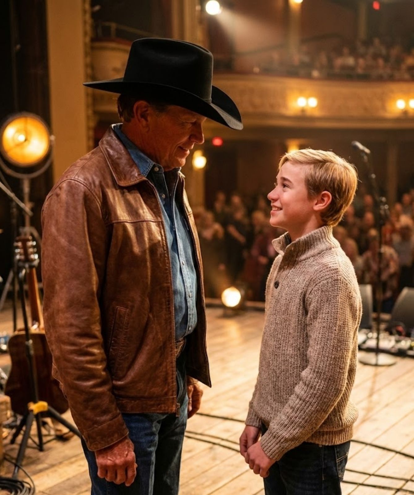 The elder voice did not overpower the younger one. It made space for it. Strait’s familiar drawl—rich like aged whiskey, slow and deliberate—flowed gently into the boy’s tone, which felt like a fresh spring rising from the earth. One voice carried history. The other carried possibility. Together, they formed something neither could create alone.