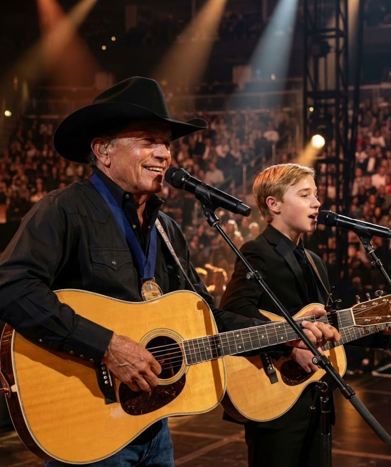 There are moments in music that arrive quietly, without warning, and yet leave an echo so deep it never truly fades. This was one of those moments. No spotlight announcement. No dramatic buildup. Just a stage, a microphone, and a shared silence that seemed to stretch across generations. When George Strait, long known as the steady heart of country music, stepped forward beside his grandson, the room sensed something rare unfolding—something that could not be rehearsed or repeated.